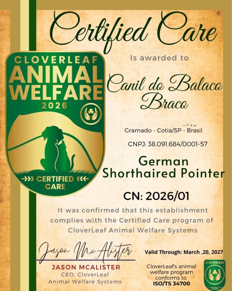 É com IMENSA alegria que eu conto para vocês que o Balaco Braco é o PRIMEIRO – isso mesmo => PRIMEIRO canil do MUNDO a receber a certificação da CloverLeaf Animal Welfare Systems.